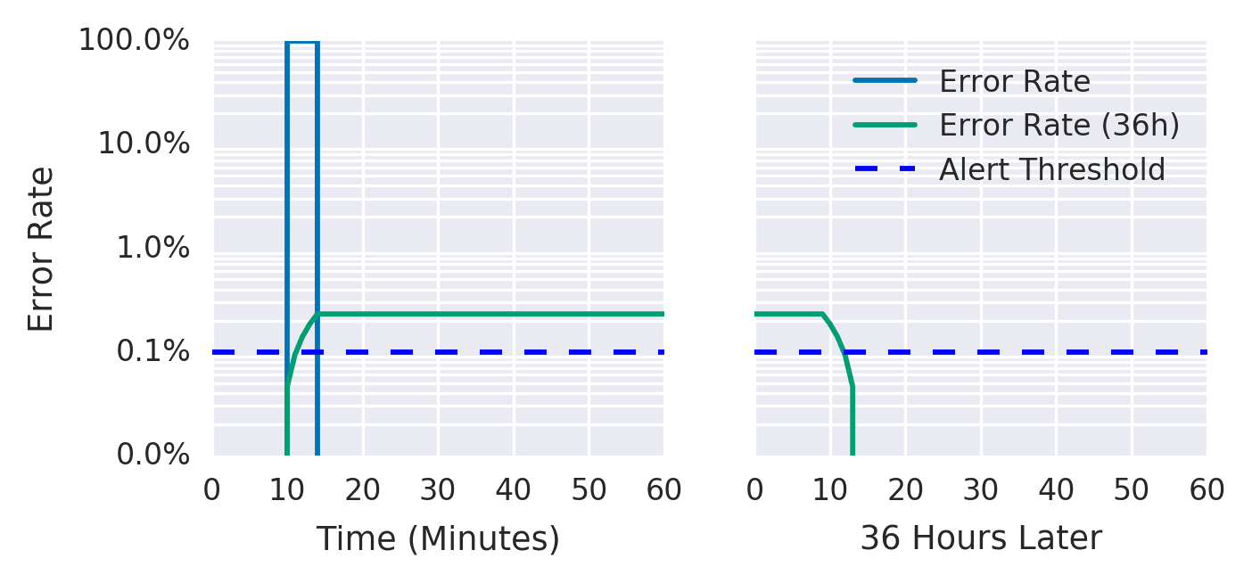 しかし、Reset Time が致命的に悪化しています。 36 時間のウィンドウは過去 36 時間分のデータを常に参照していることを意味するため、問題が解消しても過去のエラーがウィンドウから抜けるまでアラートが鳴り続けます。