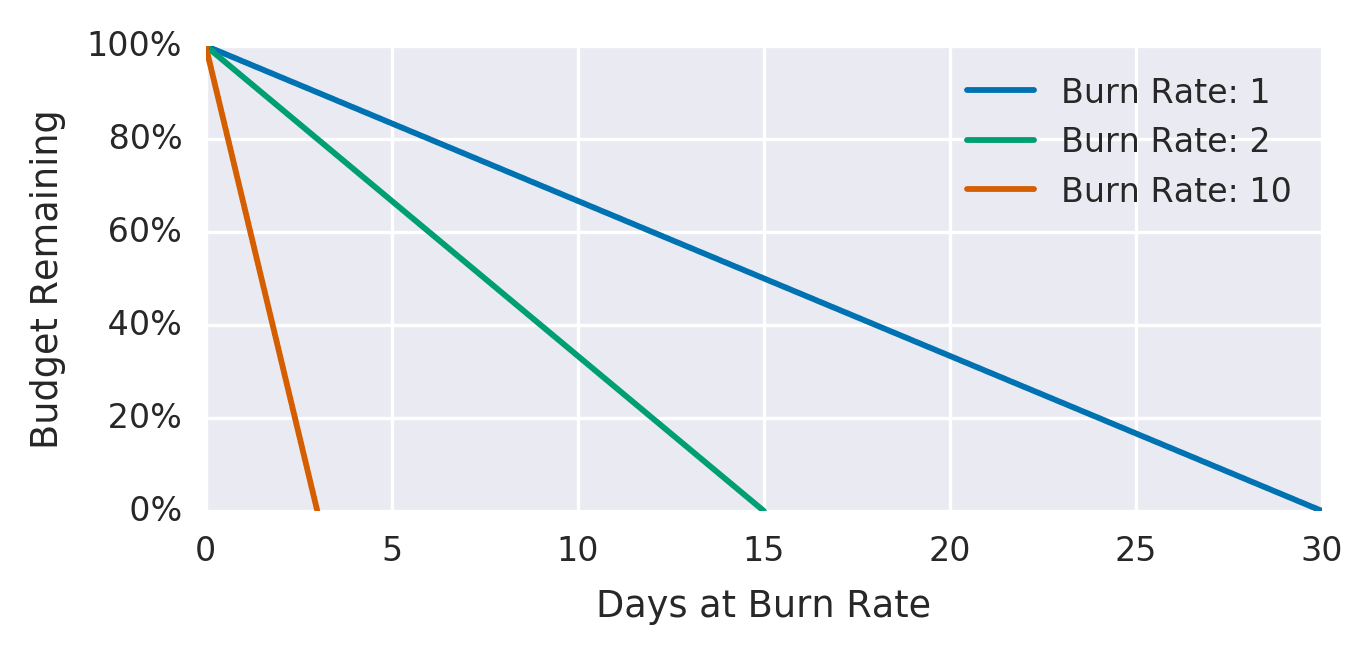 Burn Rate が 1 であれば、SLO 期間(30 日)でちょうど Error Budget を使い切るペースです。 Burn Rate が 10 であれば、3 日で Budget が枯渇する猛烈なペースになります。