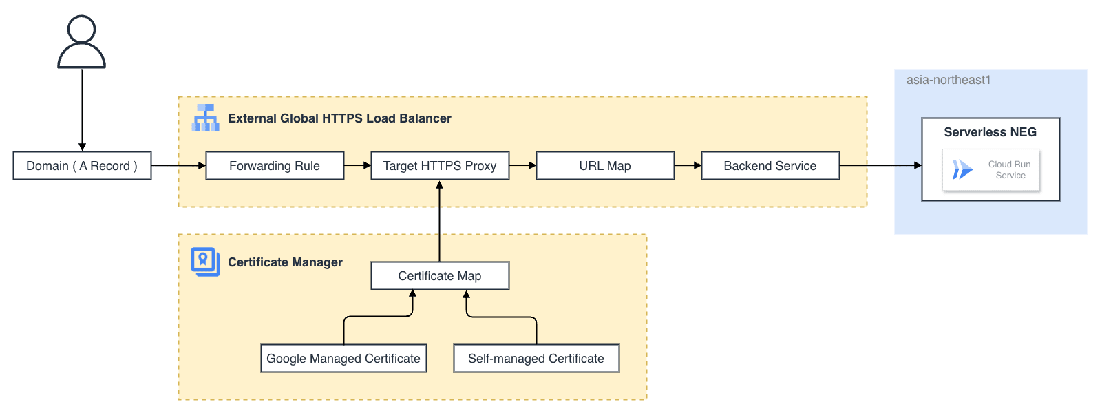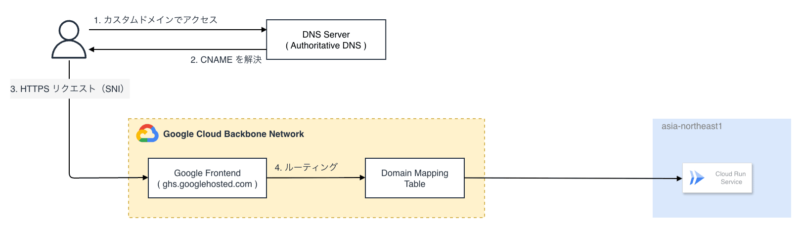Cloud Run Domain Mapping を設定すると、以下のフローでリクエストが処理されます。