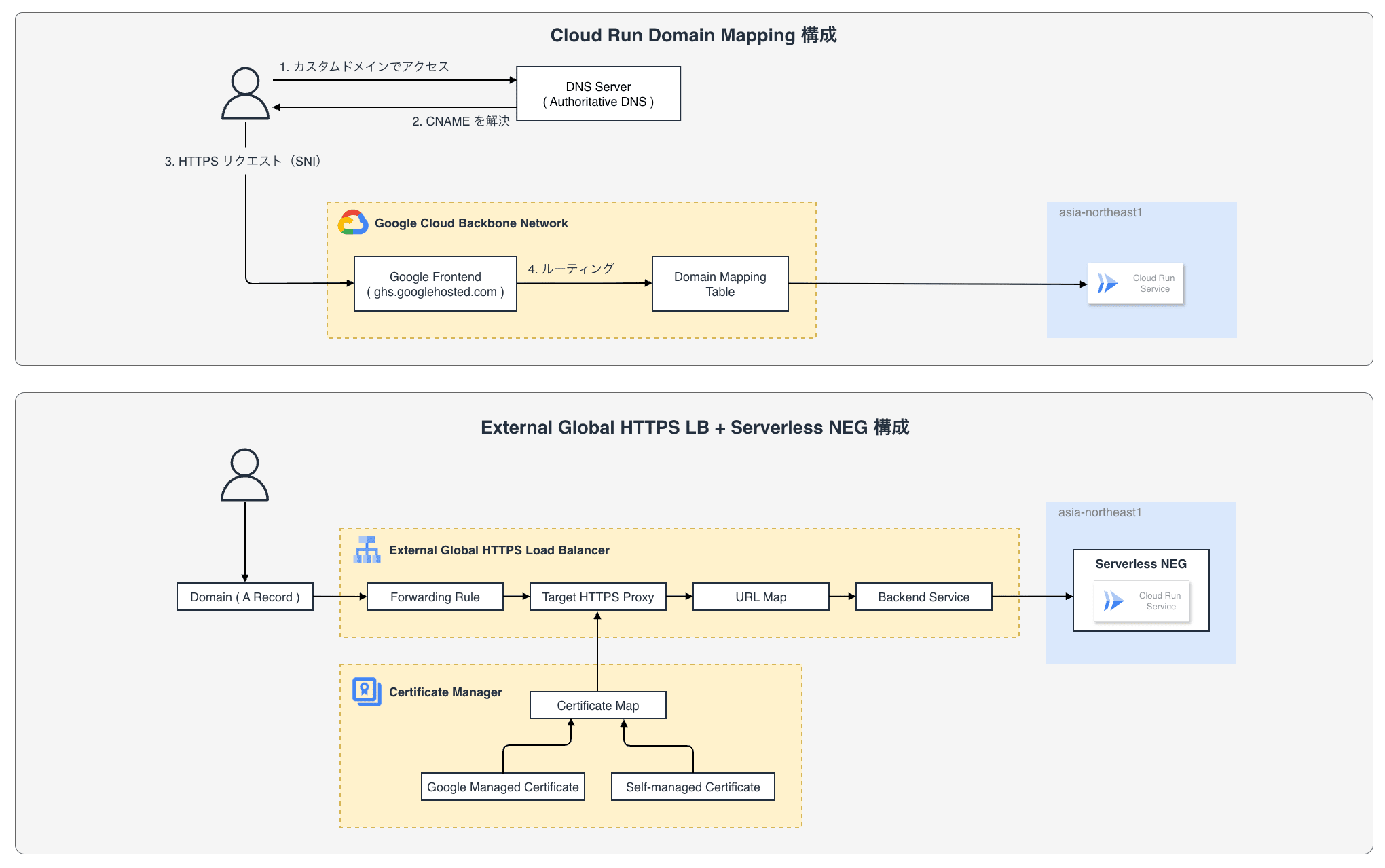 Cloud Run Domain Mapping は Cloud Run Service にカスタムドメインを直接マッピングする機能です。 (Cloud Run Job では利用できません。)
