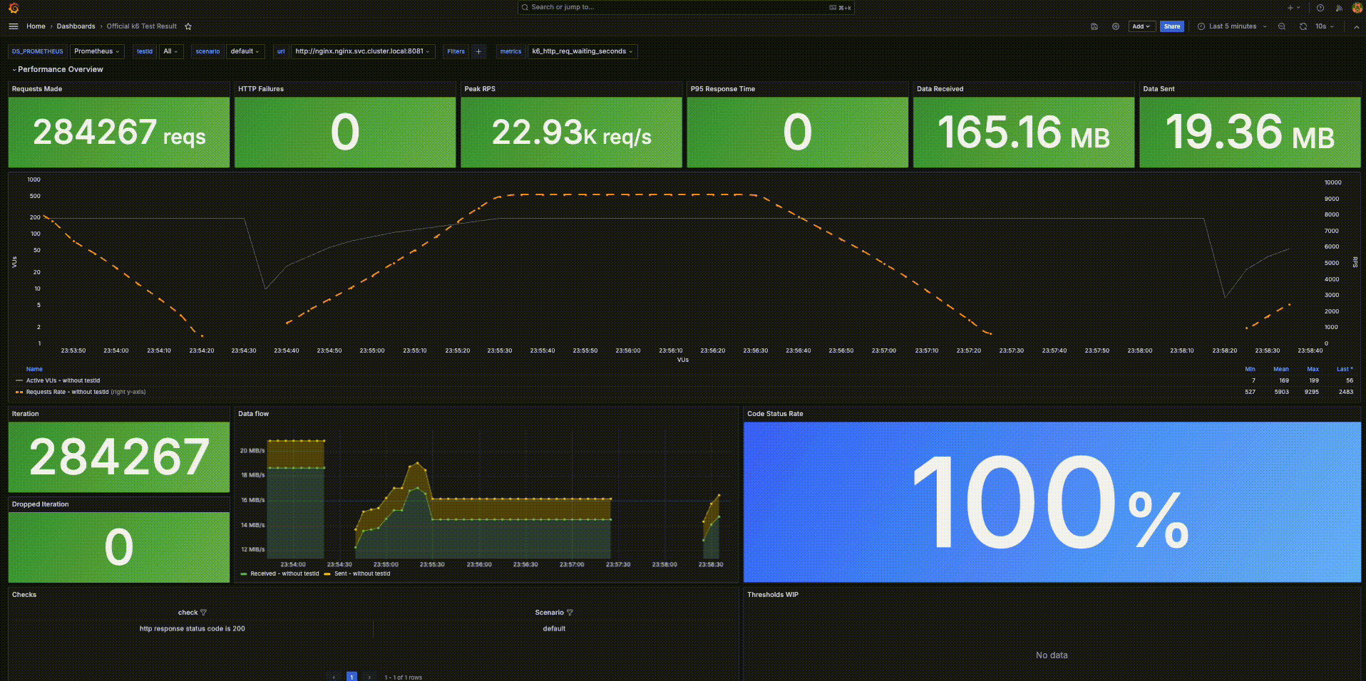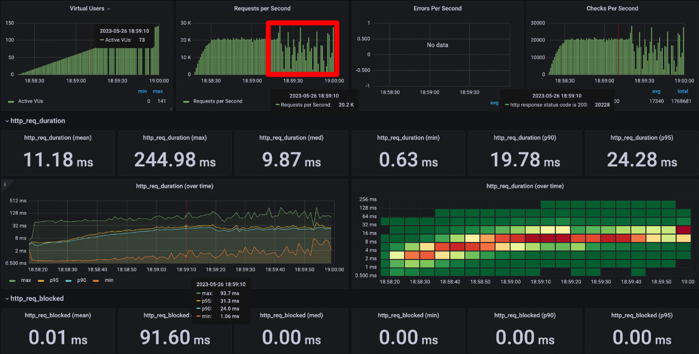 こちら のダッシュボードを使用すると、以下のように負荷試験の結果がモニタリングできます。