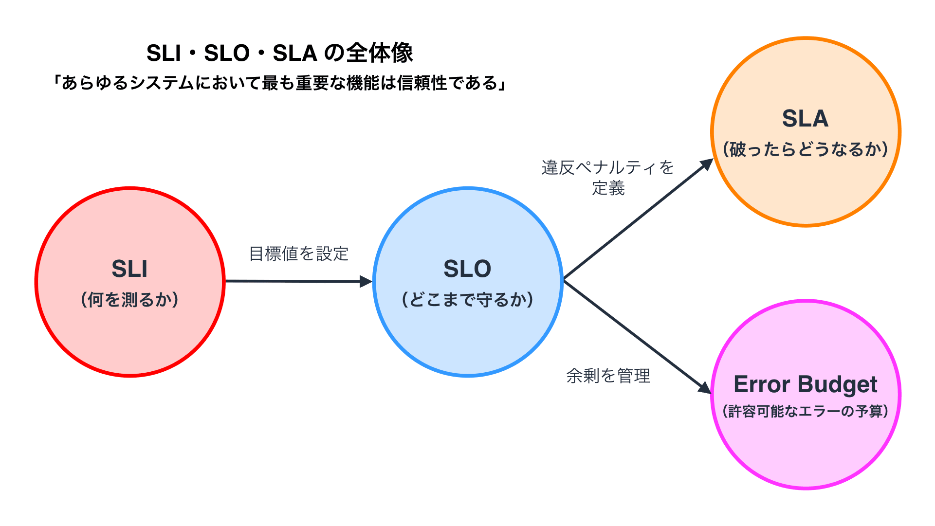 SLI は「何を測るか」、SLO は「どこまで守るか」、SLA は「破ったらどうなるか」を定義します。 それぞれは独立した概念ではなく、SLI を測定し、SLO で目標を設定し、SLA で顧客との契約を結ぶという階層構造になっています。
