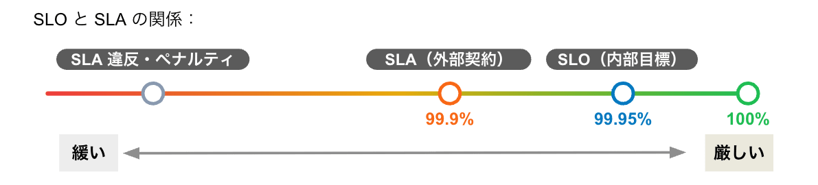 SLA は SLO を下回った場合のペナルティを含む、顧客との外部契約 です。 SLO との関係を整理すると、SLA は SLO より緩く設定することが基本です。