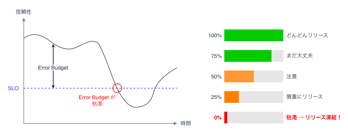 - Error Budget は SLO の裏返しとして「許容できるエラーの量」を予算化し、Budget の残量でリリースの可否を判断する