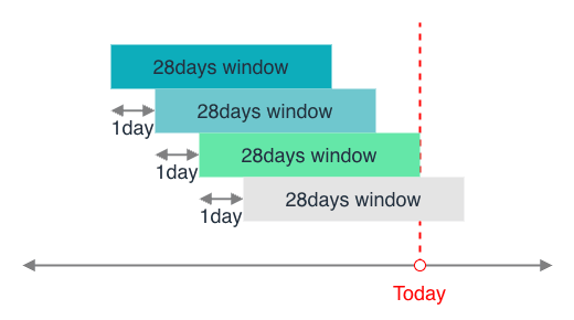 直近の一定期間(例:28 日間)を常に評価します。 評価の対象は毎日スライドするため、常に最新の状態が反映されます。