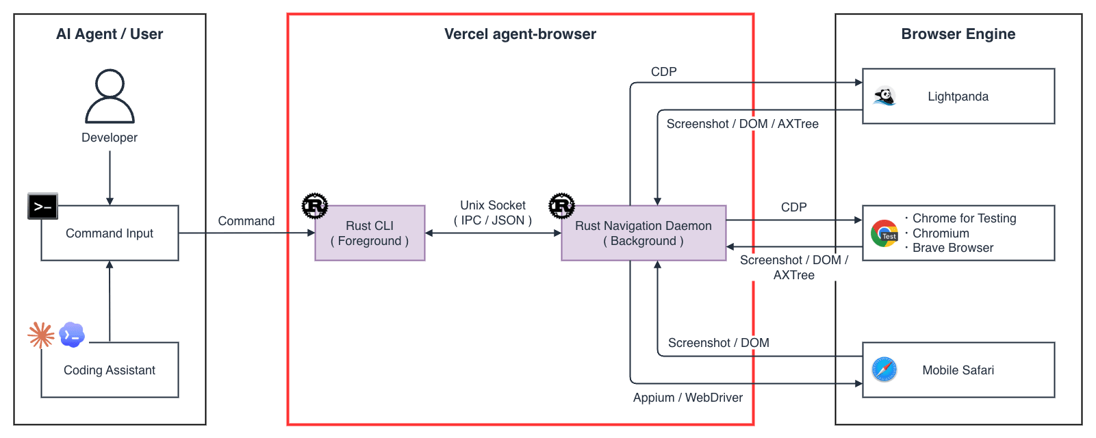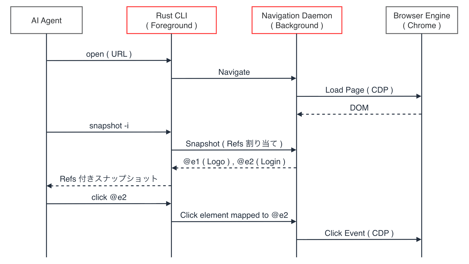 AI にとって扱いやすいコマンド体系と、複雑な DOM 操作を不要にする Refs システムが大きな特徴です。 agent-browser は Rust で実装されたネイティブバイナリとして動作し、Unix ソケット経由で Daemon プロセスと通信します。