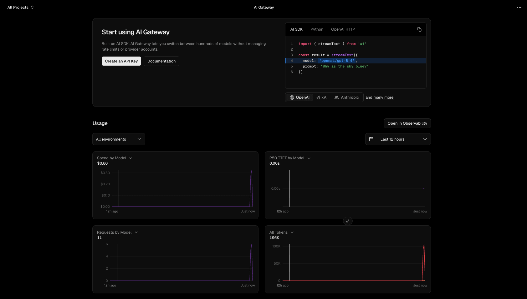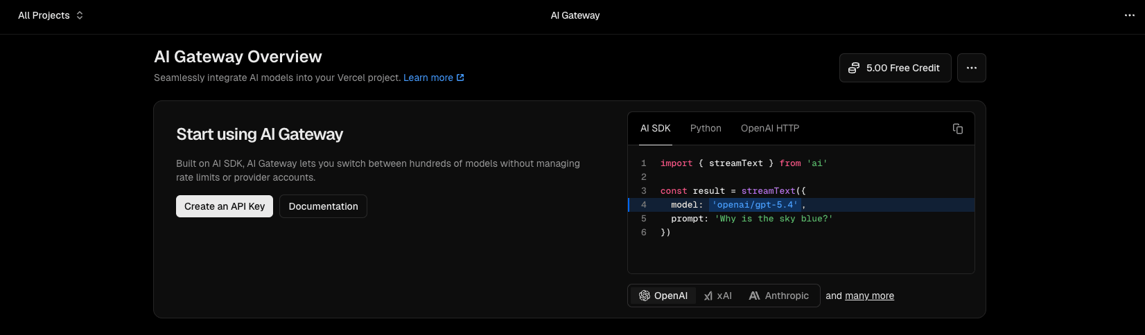 AI Gateway の利用にはクレジットが必要ですが、登録時に $5.00 分のディスカウントが付与されるため、試用の範囲であれば無料で利用できます。
