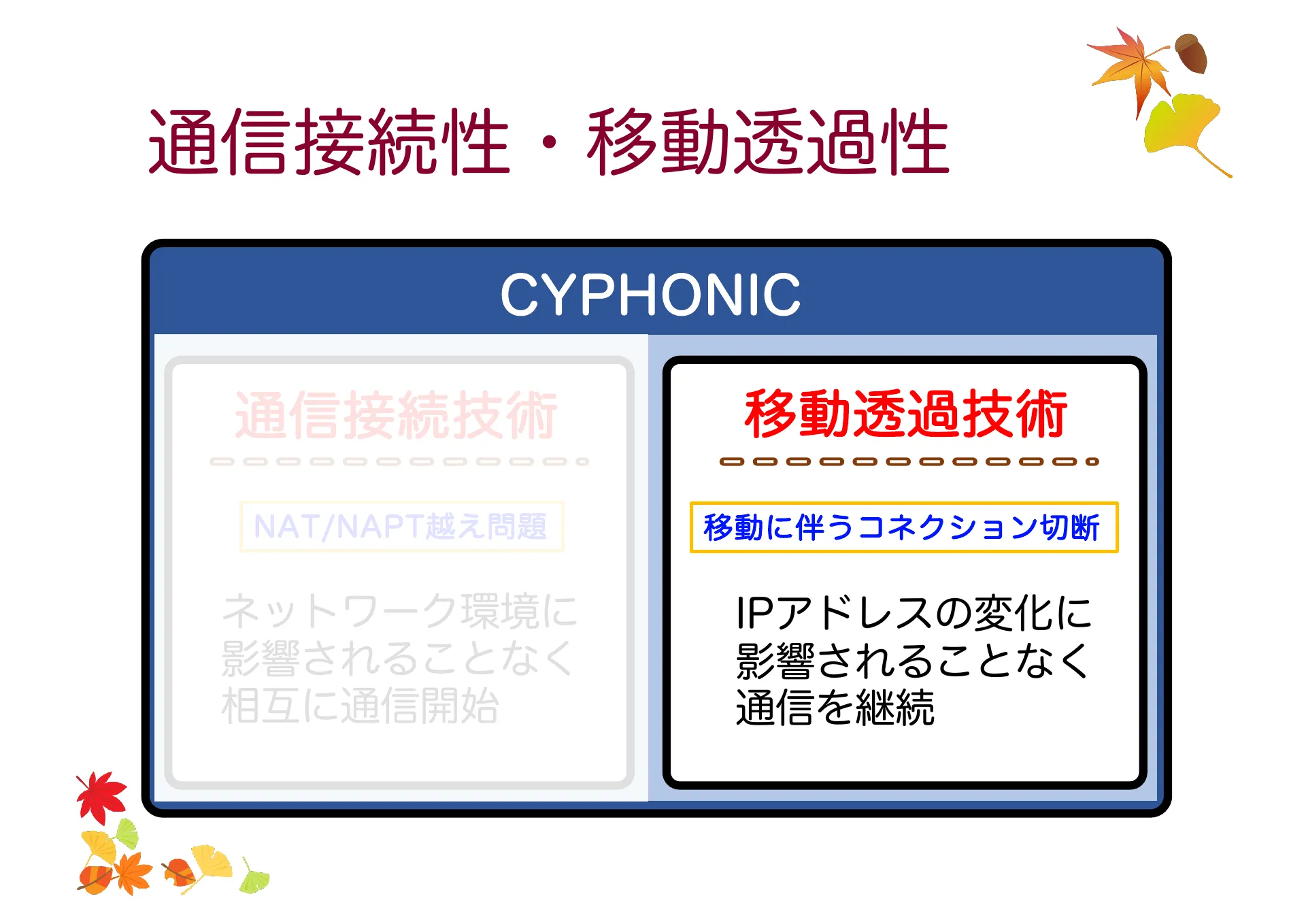 - P.2 — 通信接続性と移動透過性。CYPHONIC における NAT/NAPT 越え問題と移動に伴うコネクション切断の課題。