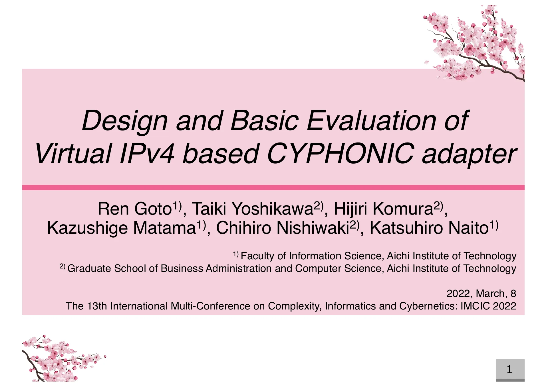 - P.1 — Title slide. "Design and Basic Evaluation of Virtual IPv4 based CYPHONIC adapter" presented at IMCIC 2022