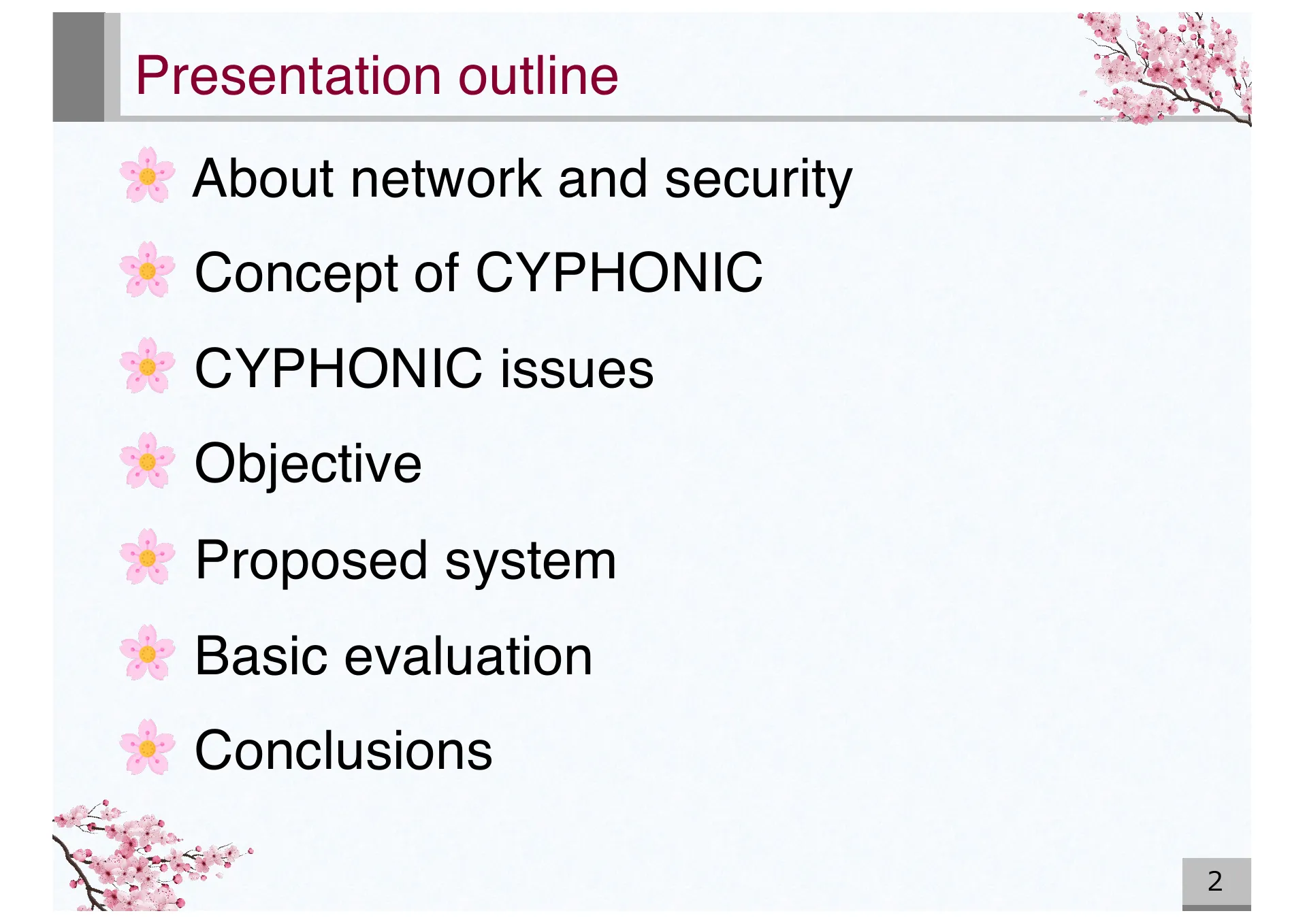 - P.2 — Presentation outline covering network security, CYPHONIC concept, issues, objective, proposed system, evaluation, and conclusions