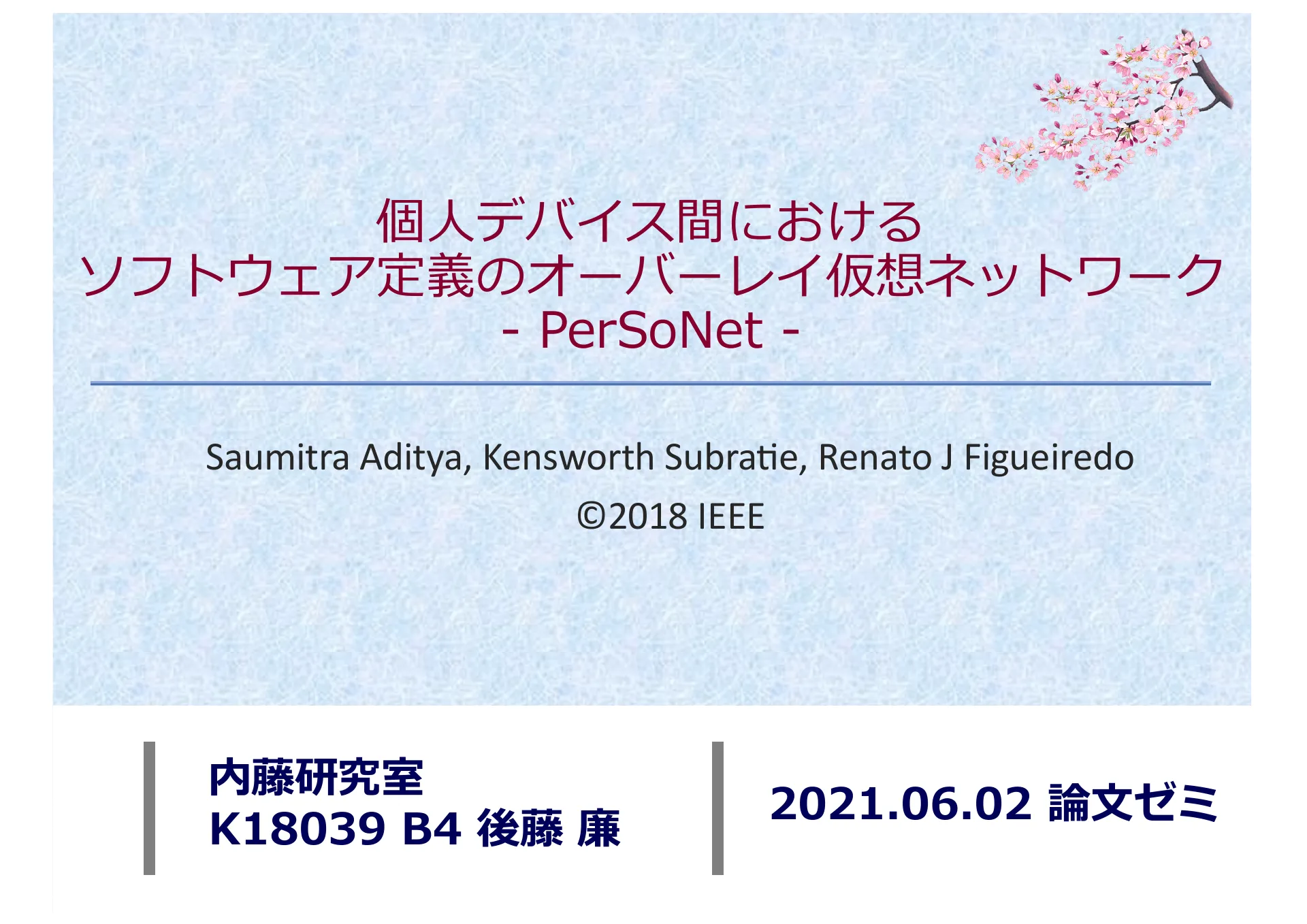 - P.1 — タイトルスライド。論文ゼミでの発表。個人デバイス間におけるソフトウェア定義のオーバーレイ仮想ネットワーク PerSoNet。