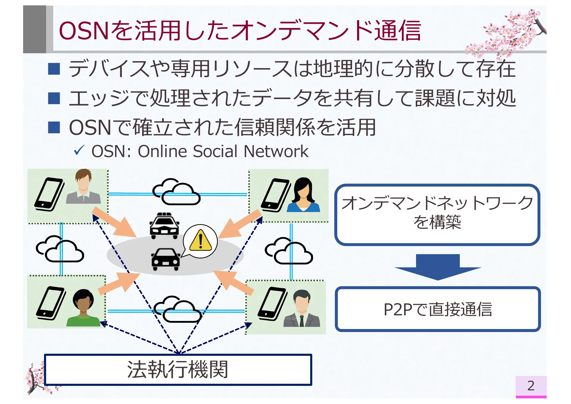 - P.2 — OSN を活用したオンデマンド通信。地理的に分散したデバイスやリソースを信頼関係に基づいて接続。