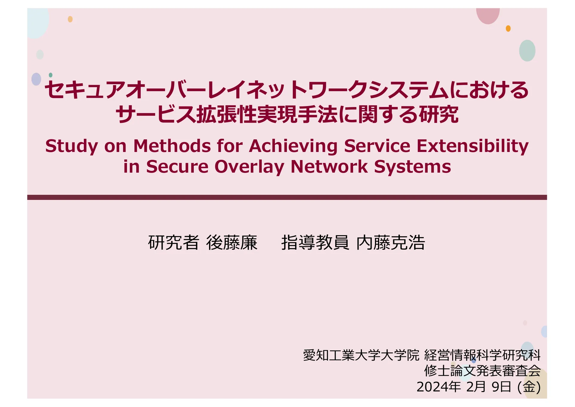 <script defer class="ren510-slide-embed" data-slug="study-on-methods-for-achieving-service-extensibility-in-secure-overlay-network-systems" data-ratio="1.7777777777777777" src="https://www.ren510.dev/static/slides/embed.js"></script>🤖 AI による要約 ✨