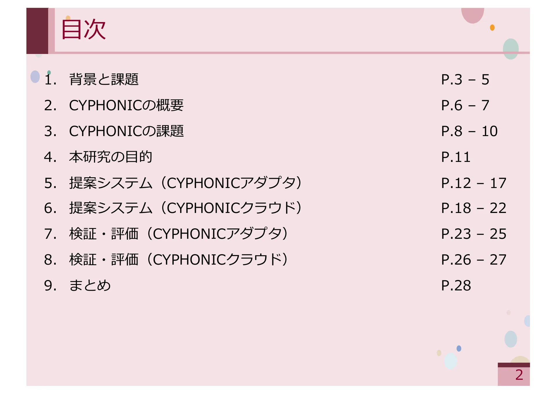 - P.2 — 目次。背景と課題、CYPHONIC の概要・課題、提案システム、検証・評価、まとめの9章構成。
